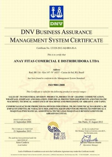 A Anay Fitas recebeu nos dias 20 e 21 de agosto de 2012, o representante da DNV para a segunda auditoria de recertificação. No decorrer, o Auditor constatou que o Sistema de Gestão da Qualidade está em conformidade com os requisitos da norma ISO 9001 versão 2008. Assim, fomos recomendados pelo órgão certificador a manter o nosso sistema.