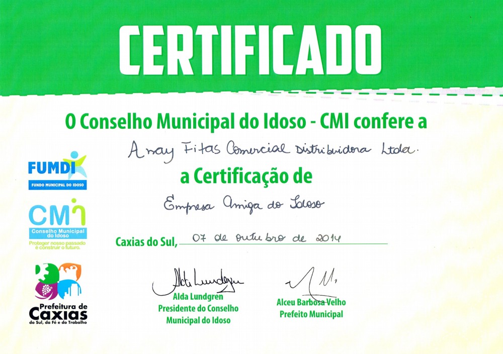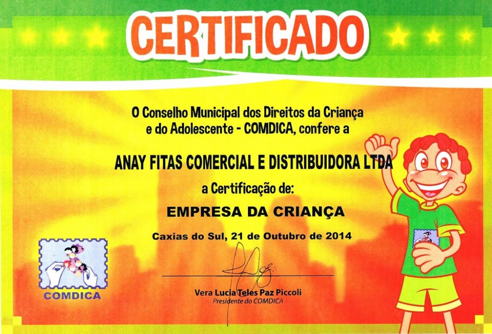 No dia 07 e 21 de outubro a empresa recebeu o certificado de EMPRESA DA CRIANÇA e EMPRESA AMIGA DO IDOSO.
