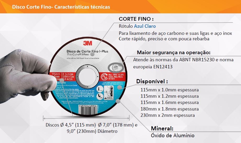 O Disco de Corte Fino 3M™ I-PLUS oferece tecnologia de disco corte fino aplicada para um corte preciso, rápido e sem rebarbas. Conta com alta performance e segurança, além de rendimento superior com qualidade 3M™. Indicado para cortes rápidos de tubos, barras, chapas e superfícies em geral.