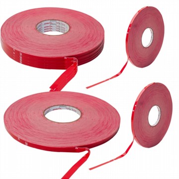 Fita de adesivo acrílico transferível, branca, com uma massa espumada auto-adesiva e protegida em um dos lados por liner. Utilizada para a fixação de inúmeras peças externas ou internas aos veículos no mercado de reposição. Possui alta densidade e viscoelasticidade, permitindo seu alongamento e relaxamento quando submetida a esforças, minimizando a tensão sobre a linha de adesivo. Possui uma excelente adesão inicial e alta resistência ao arrancamento e cisalhamento. Resiste a solventes e a intempéries.