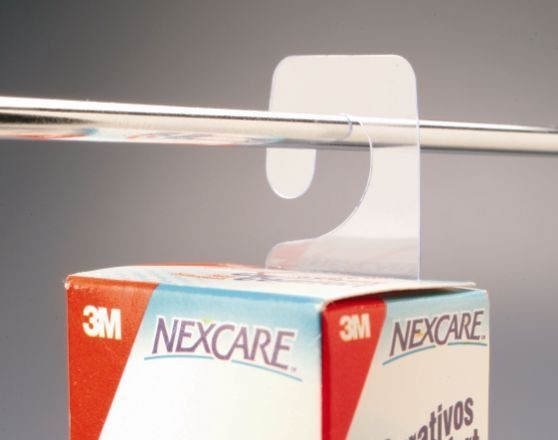 Fita de poliéster com furo que possibilita que produtos sejam expostos em gancheiras do tipo display. Suportam de 250g a 350g. De fácil manuseio e aplicação, já vem com adesivo para fixar no produto.